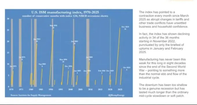 ISM制造业指数已连续18个多月处于收缩状态,创二战后最长纪录,但股市持续上涨,背后的原因是盈利集中在科技垄断型企业和金融行业。