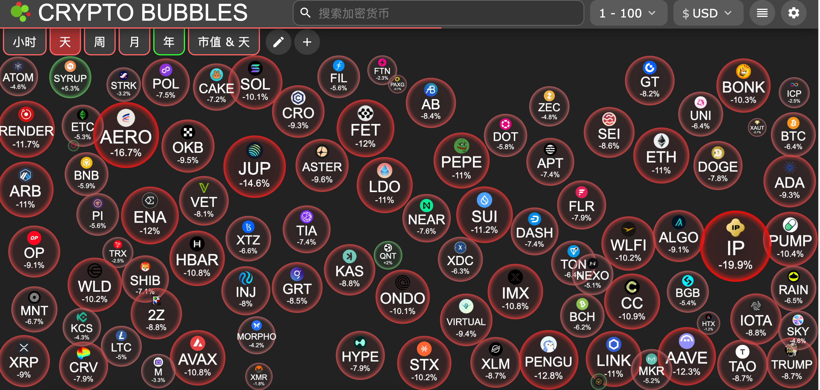 今日市值前100币种最大跌幅:Story跌19.9%、Aerodrome Finance跌16.7%、Jupiter跌14.6%、Pudgy Penguins跌12.8%、Aave跌12.3%。