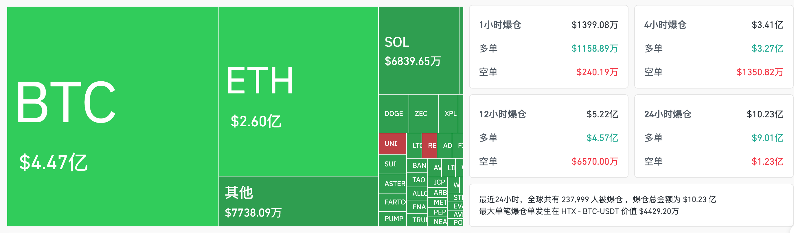 24小时爆仓数据:全球共237999人被爆仓 ,爆仓总金额为10.23亿美元,其BTC爆仓4.47亿美元、ETH爆仓2.6亿美元、SOL爆仓6839万美元