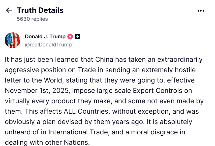 由此可见,引发本次史诗级暴跌的导火索极有可能是地缘政治风险的升级。美国总统特朗普通过Truth Social宣布,作为对中国扩大稀土元素出口限制的报复,美国将从11月1日起对所有中国进口商品额外加征100%关税,其强硬的贸易政策声明瞬间点燃了全球资本市场的恐慌情绪。