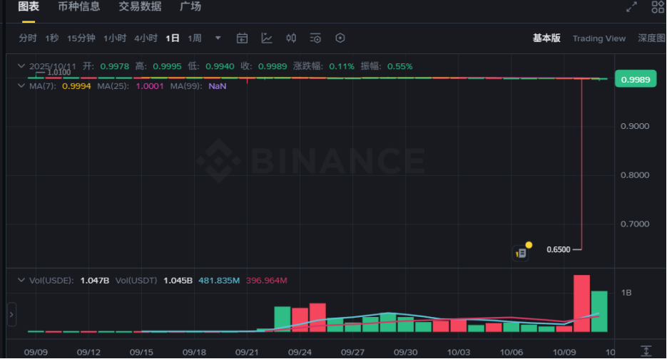 由于USDe被用作主要抵押品,清算系统便成为了USDe的巨大抛压,因其规模远超市场对USDe的实时承接能力,导致USDe在币安上的交易价格脱锚,一度暴跌至0.65美元。