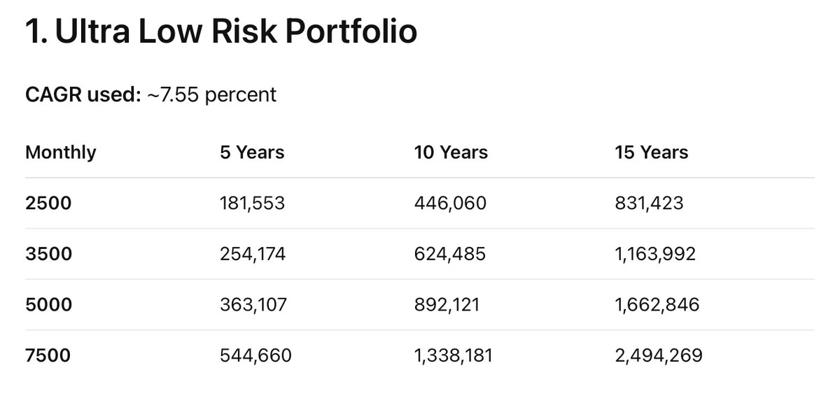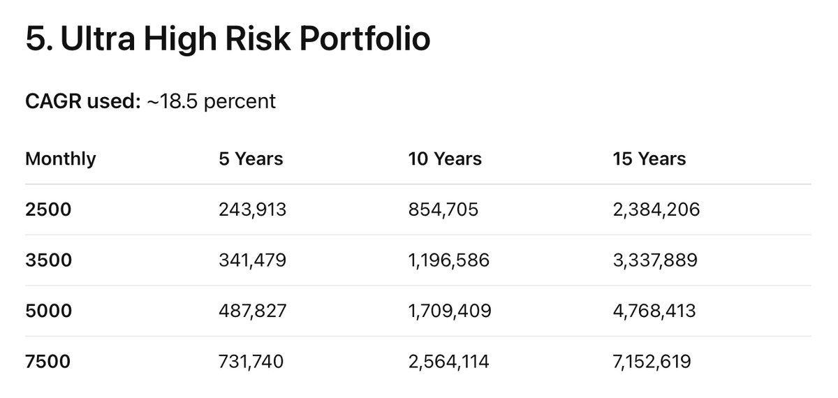 以下是五种投资组合,附有其波动性和复合年增长率(CAGR)的预期,以及5年、10年和15年后的预期回报。