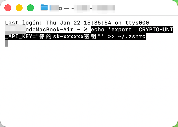 echo 'export CRYPTOHUNT_API_KEY="你的sk-xxxxxx密钥"' >> ~/.zshrc