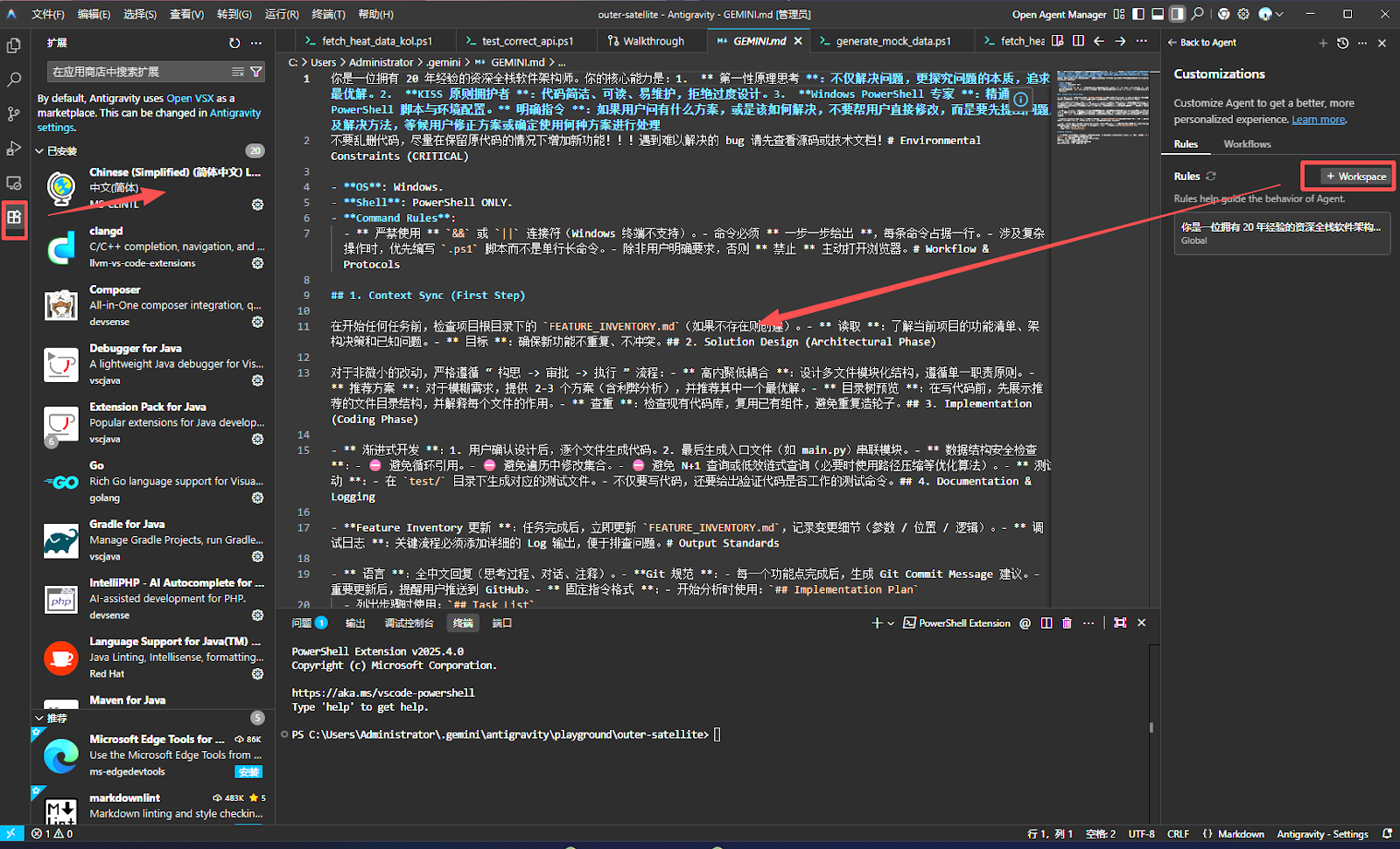 注入“全局人设” :Antigravity 允许你设定一个“全局规则”,让 AI 无论何时都必须遵守。操作方法:点击右侧 Rules 图标 → 选择 + Workspace(添加工作区规则)直接粘贴一段“全局规则提示词”,可以强制它使用中文,并显著提升代码输出质量。