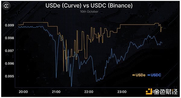 2025年10月11日,加密市场经历了极端去杠杆事件——数小时内约200亿美元的头寸被清算,各大中心化交易所和去中心化交易所的未平仓合约量大幅萎缩。在这一过程中,受币安预言机设计(该设计随后遭到批评)影响,USDe在币安上的交易价格一度跌至约0.65美元。然而,在Curve等流动性更充足的链上平台,USDe的价格仍接近平价(见下图),且赎回功能正常运行——这表明这是特定平台的价格错位,而非系统性脱锚。盖伊在X平台上发布的推文详细解释了10月11日的事件经过,值得一读。
