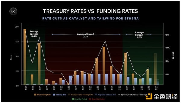 Ethena策略的另一个独特之处在于其与联邦基金利率的温和负相关性。与国债支持型稳定币不同,Ethena有望从利率下降中受益——因为低利率会刺激经济活动,增加杠杆需求,推高资金费率,并强化支撑Ethena收益的基差交易。2021年就出现过类似情况,当时资金费率与国债利率的利差扩大至10%以上。