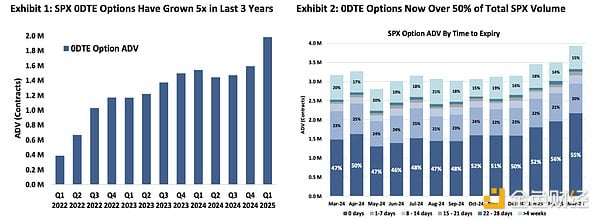 全球股票市场规模约为100万亿美元,几乎是整个加密市场的25倍,仅美国股票市场规模就达60万亿美元。与加密市场一样,股票市场参与者对杠杆也有强烈需求。零到期日(0DTE)期权的爆发式增长就印证了这一点——这类期权主要由散户投资者交易,占标普500指数(SPX)期权交易量的50%以上。散户投资者显然希望以杠杆形式获取标的资产的价格波动敞口,而代币化股票的永续合约可以直接满足这一需求。