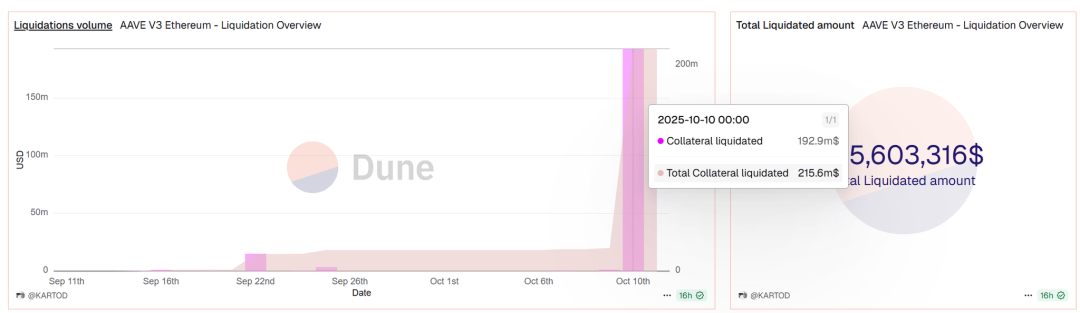 我们同时通过第三方数据分析平台对 Aave 的清算情况进行了追踪。数据显示,尽管在市场暴跌期间(2025 年 10 月 10 日至 11 日)Aave 的整体清算量高达 1.92 亿美元,但其中与 USDe 和 sUSDe 相关的清算事件极少,几乎可以忽略不计。