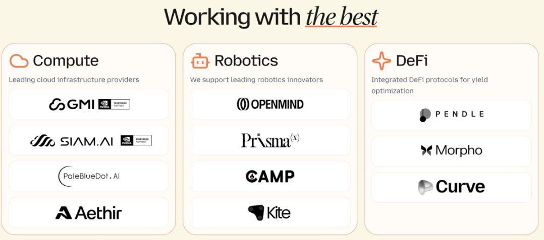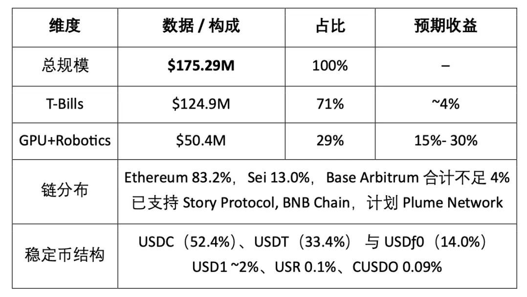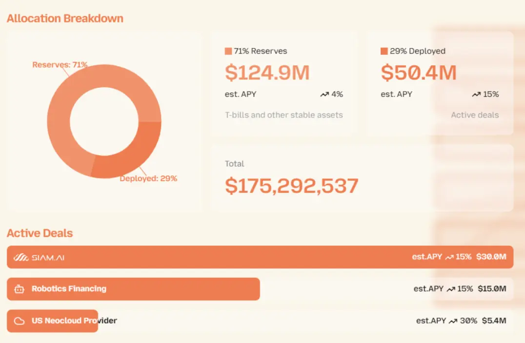 - 已部署资产(Deployed)占 29%,约 $50.4M,用于链下 GPU 与机器人融资项目,平均年化收益约 15%。