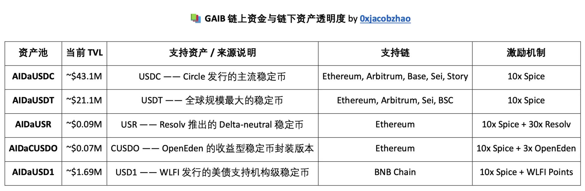 在 Final Spice 阶段,GAIB 通过 AIDα 机制开放了多元化的稳定币入口,包括 USDC、USDT、USR、CUSDO 以及 USD1。用户存入稳定币后,会获得对应的 AIDα 收据 Token(如 AIDaUSDC、AIDaUSD1),该 Token 即代表存款凭证,并自动计入 Spice 积分体系,可进一步参与 Pendle、Curve 等 DeFi 组合玩法。