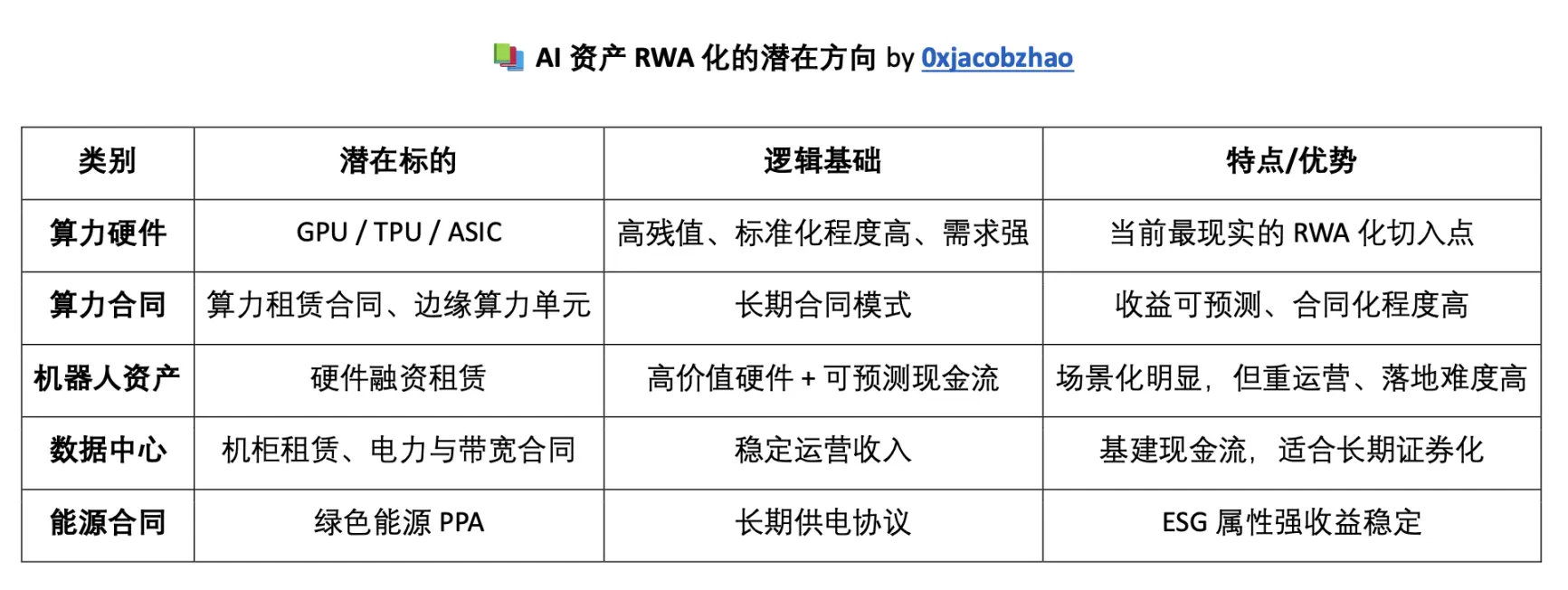 总体而言,AI 资产的 RWA 化可以分为几个层次:短期以内以 GPU 等算力硬件与算力合同为核心;中期则扩展至数据中心与能源合同;而长期来看,机器人硬件与服务合同有望在特定场景中实现突破。其共同逻辑均围绕 高价值硬件 + 可预测现金流,但落地路径存在差异。