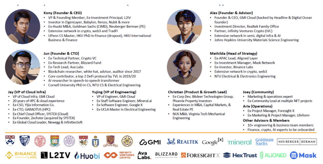 GAIB 团队汇聚了来自 AI、云计算与 DeFi 领域的专家,核心成员曾任职于 L2IV、火币、 高盛、Ava Labs 与 Binance Labs 等机构。团队成员毕业于康奈尔大学、宾夕法尼亚大学、南洋理工大学与加州大学洛杉矶分校,具备深厚的金融、工程与区块链基础设施经验,共同构建起连接真实世界 AI 资产与链上金融创新的坚实基础。
