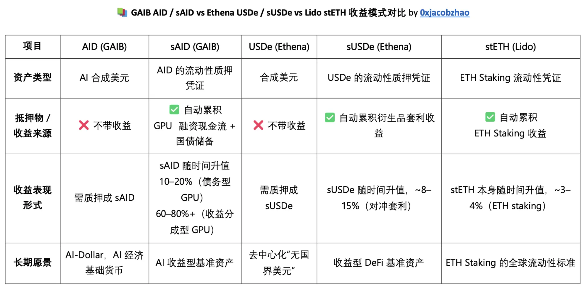 GAIB AID / sAID vs Ethena USDe / sUSDe vs Lido stETH 收益模式对比