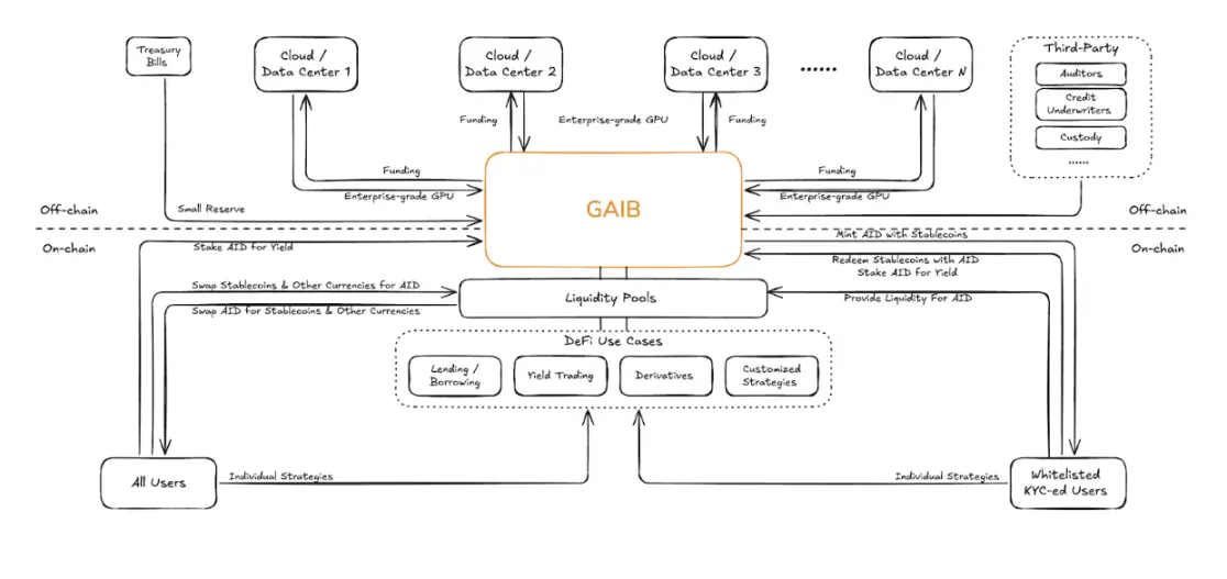 GAIB 正是在此背景下诞生,它并非将 AI 硬件直接代币化,而是将企业级 GPU 或机器人作为抵押的融资合同上链,构建起连接链下现金流与链上资本市场的经济桥梁。在链下,由云服务商与数据中心购置并使用的企业级 GPU 集群或机器人资产作为抵押物;在链上,AID 用于稳定计价与流动性管理(非生息,T-Bills 全额储备);sAID 用于收益敞口与自动累计(底层为融资组合 + T-Bills)。