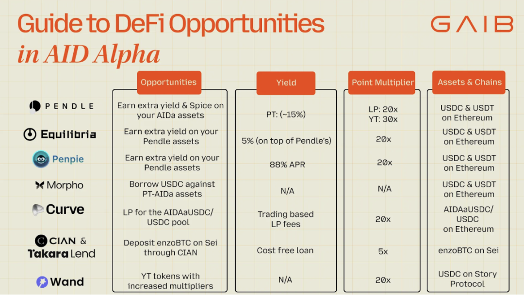 在 AID Alpha 阶段,GAIB 将 AID/aAID 资产与多类 DeFi 协议深度集成,通过 收益拆分、流动性挖掘、抵押借贷与收益增强 等方式,形成了跨链、多元的收益优化体系,并以 Spice 积分 作为统一激励。