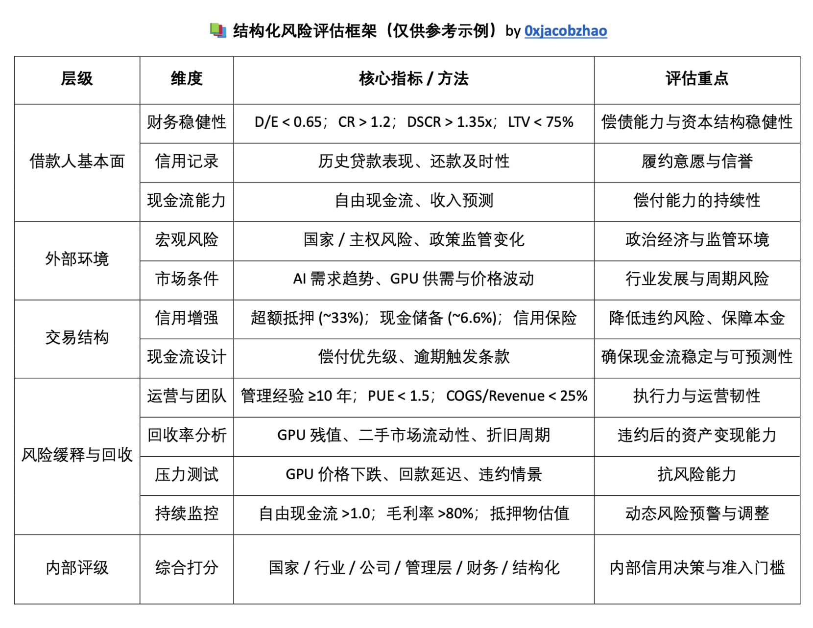 - 信用与风控:通过超额抵押(约 30%)、现金储备(5–7%)、信用保险与违约处置(GPU 清算 / 托管运营)保障安全性;并配合第三方承销与尽调,建立内部信用评级体系。