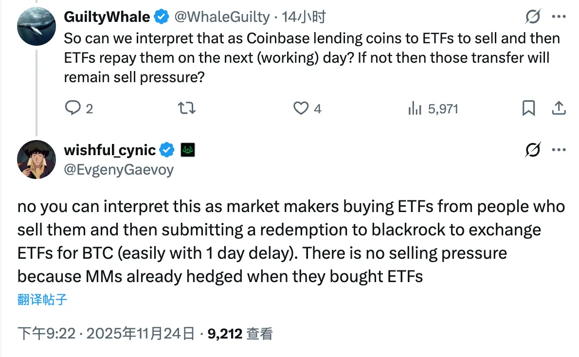 11 月 25 日凌晨,做市巨头Wintermute 创始人 Evgeny Gaevoy 于 X 就此事发表评论表示:「这(贝莱德的大额转账)其实是一个滞后性很强的指标。抛售早已在 ETF 中发生。做市商的链上转账往往也是一样的情况。」