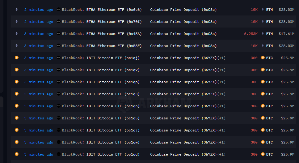 首先需要明确的一点是,所谓的贝莱德大额转账,指的是贝莱德现货比特币 ETF(IBIT)以及现货以太坊 ETF(ETHA)的储备地址向 Coinbase Prime 托管地址进行加密货币转账。
