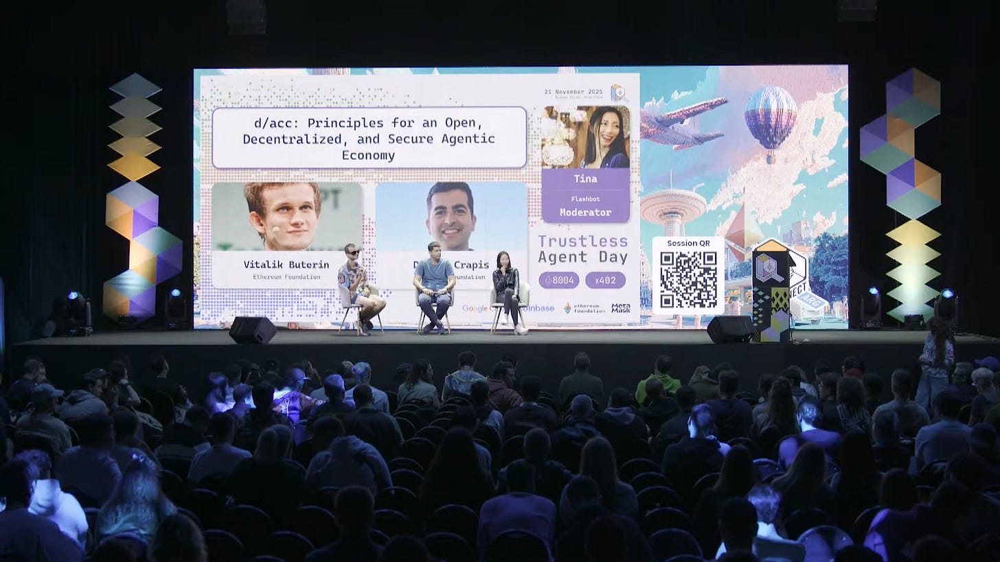 在以太坊 Devconnect 期间,一场名为Trustless Agent Day的活动聚集了当前 Web3 与 AI 交叉领域最前沿的思考者。这场压轴 Panel 由 Flashbots 的Tina主持,核心嘉宾是以太坊联合创始人Vitalik Buterin和以太坊基金会 dAI 团队负责人Davide Crapis。