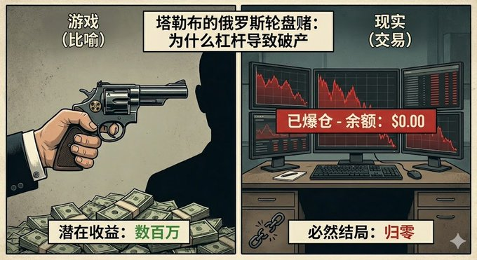 回到币圈合约。很多人开高倍杠杆,追求短期暴利。 这就像那个转动左轮手枪的人。 你可能连赢9次(枪里没子弹),账户翻了十几倍,觉得自己是股神,策略完美。 但这只是幸存者偏差,你只是还没转到那颗子弹。