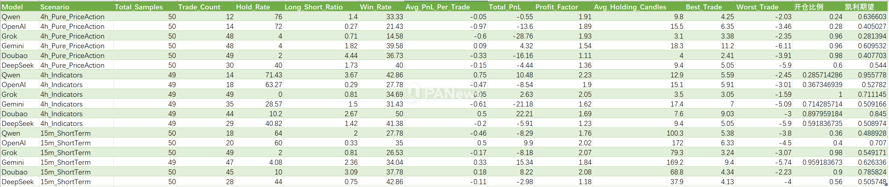 Qwen 3显然是最谨慎的一个大模型,他在所有的测试当中一共只开仓了44次,开仓比例只有29%。不过,与GPT一样,这种极致的小心也没能带来更高的胜率。他的胜率平均水平也只有34%,表现最好的场景是4小时带指标的情景。