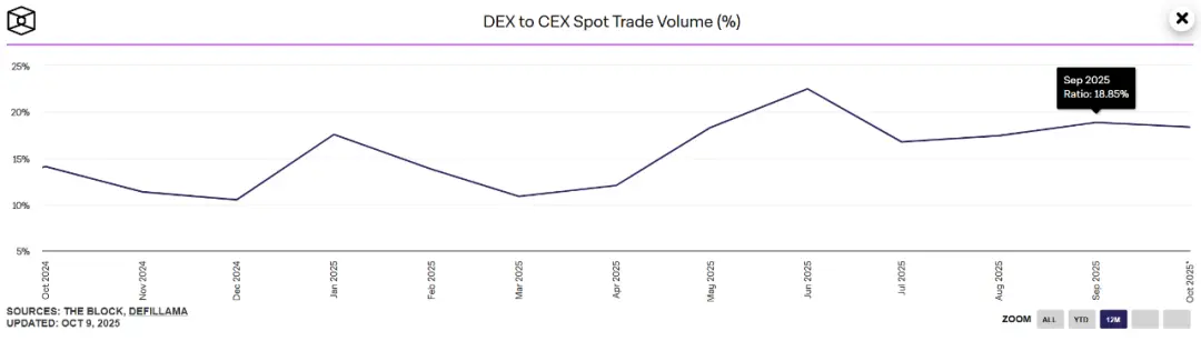 根据The Block数据,DEX交易量占中心化交易所现货总量的17.7%,较第二季度及历史前高提升0.1个百分点。