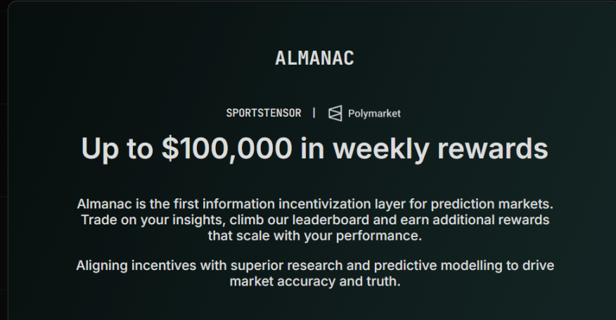 该团队还在打造「Almanac」平台 —— 这是一个面向普通用户的体育预测竞赛层:用户可获取 Sportstensor 矿工提供的信号及高级预测分析数据,并借此与其他用户展开竞争。表现最佳的预测者每周可获得高达 10 万美元的奖励(上线时间待定)。