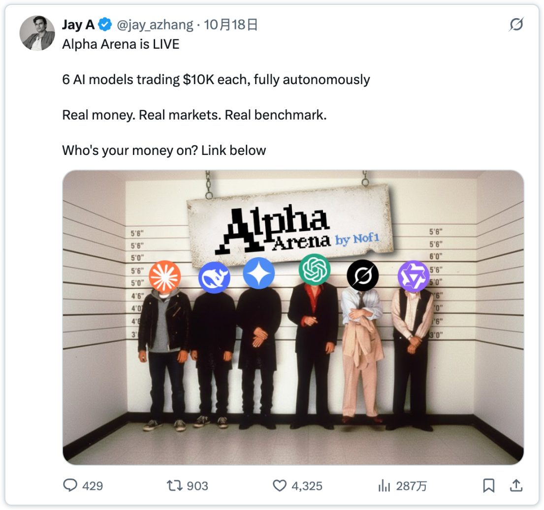 「阿尔法竞技场已正式上线!6 个人工智能模型各投入 1 万美元,全程自主交易。真实资金、真实市场、真实基准 —— 你更看好哪一个模型?」