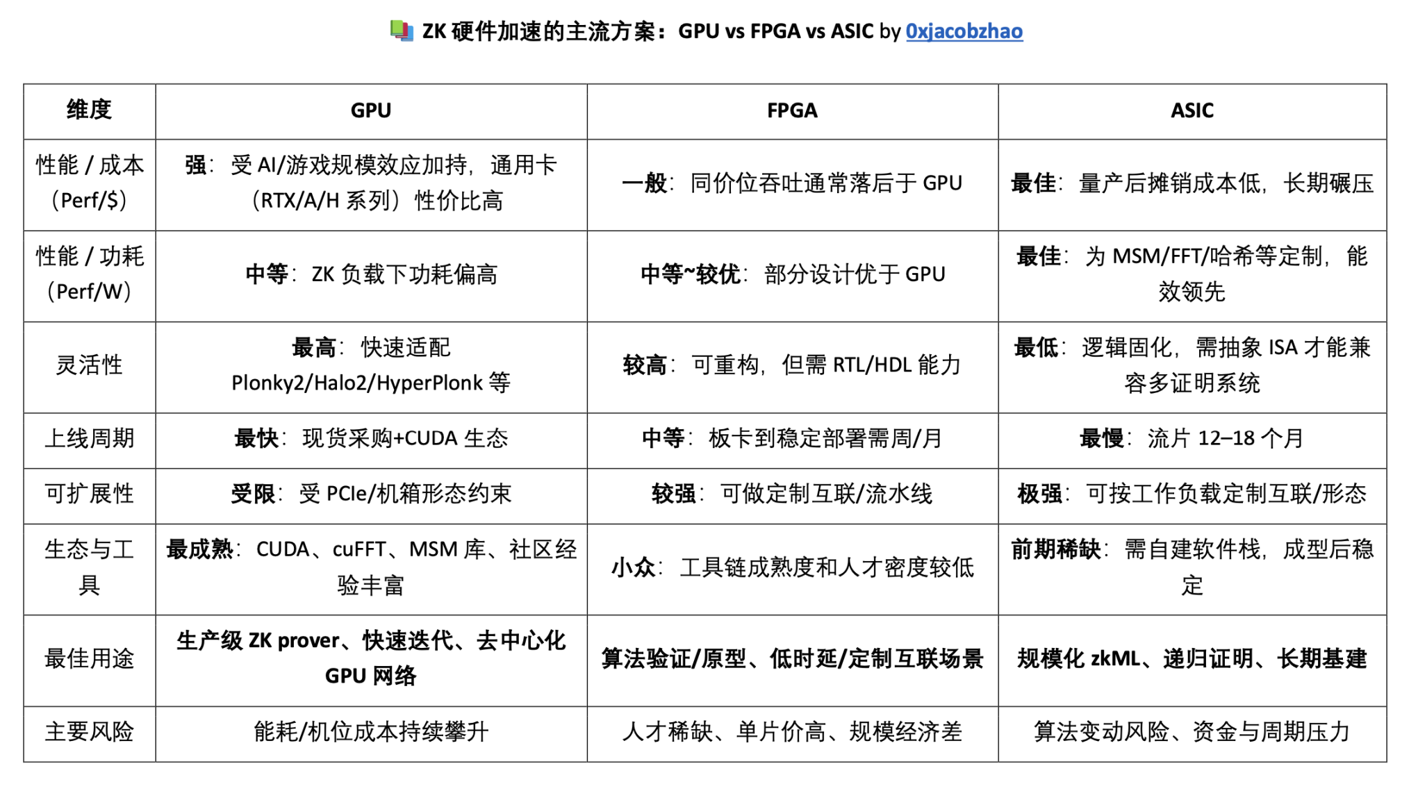 GPU、FPGA 和 ASIC 构成了硬件加速的三大主流方案:GPU 以通用并行架构和成熟生态在 AI、ZK 等领域广泛应用;FPGA 依靠可重构特性适合算法快速迭代和低延迟场景;ASIC 则通过专用电路实现极致性能与能效,是规模化和长期基础设施的最终形态。