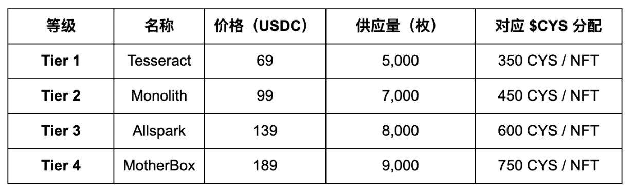- 固定 Token 收益:每枚 NFT 锁定一定比例 $CYS 分配;