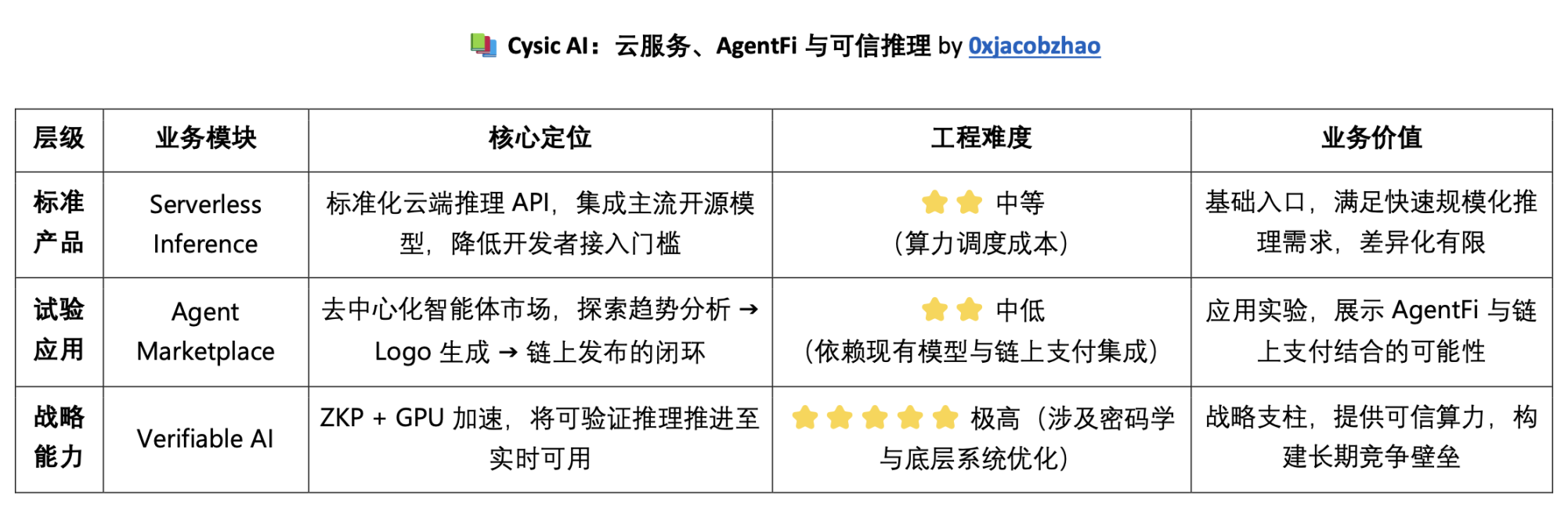 整体来看,Cysic AI 的三层路径形成了一条自下而上的演进逻辑:Serverless Inference 解决「能用」,Agent Marketplace 展示「能应用」,Verifiable AI 则承担「可信性与护城河」。前两者更多是过渡与试验,真正的价值和差异化将在 Verifiable AI 的落地中体现,其与 ZK 硬件及去中心化算力网络结合,才是 Cysic 未来在 ComputeFi 生态中建立长期优势的关键。