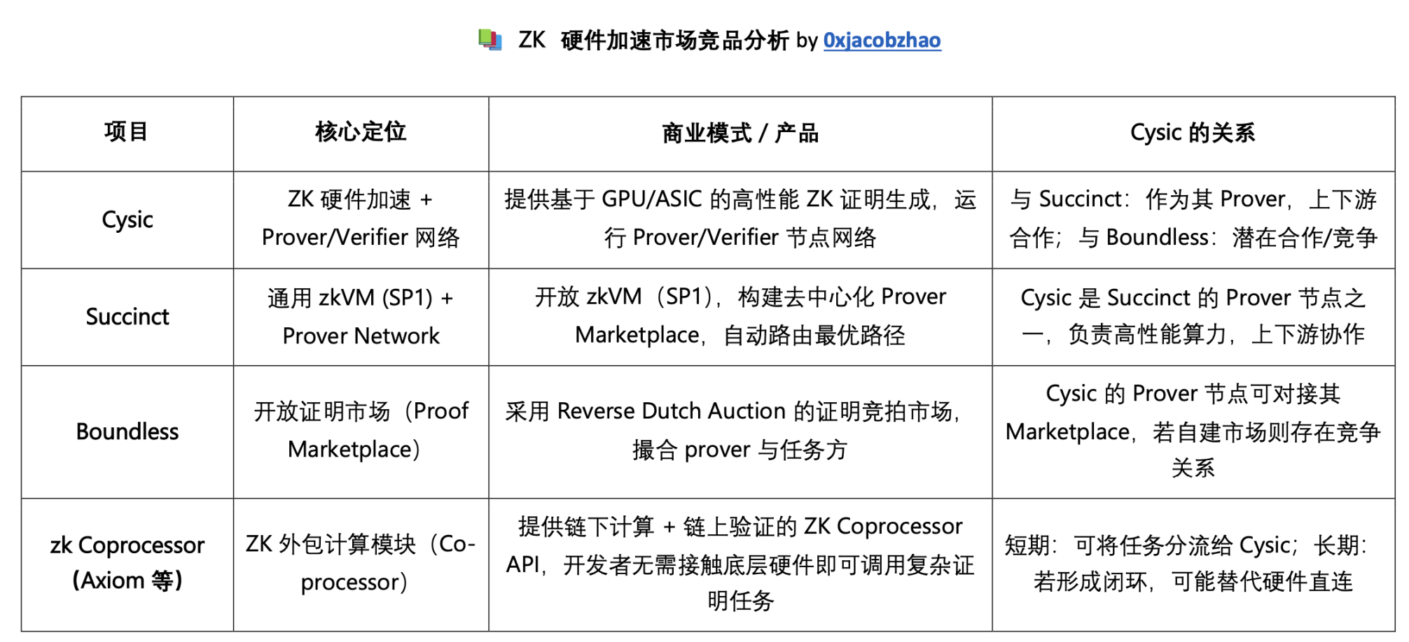 在 ZK Marketplace、Prover Network 与 zk Coprocessor 赛道,Cysic 当前更多扮演 上游算力供应商 的角色,而 Succinct、Boundless、Risc0、Axiom 等项目则通过 zkVM、任务调度和开放市场撮合切入同一客户群(L2、zkRollup、ZKML)。