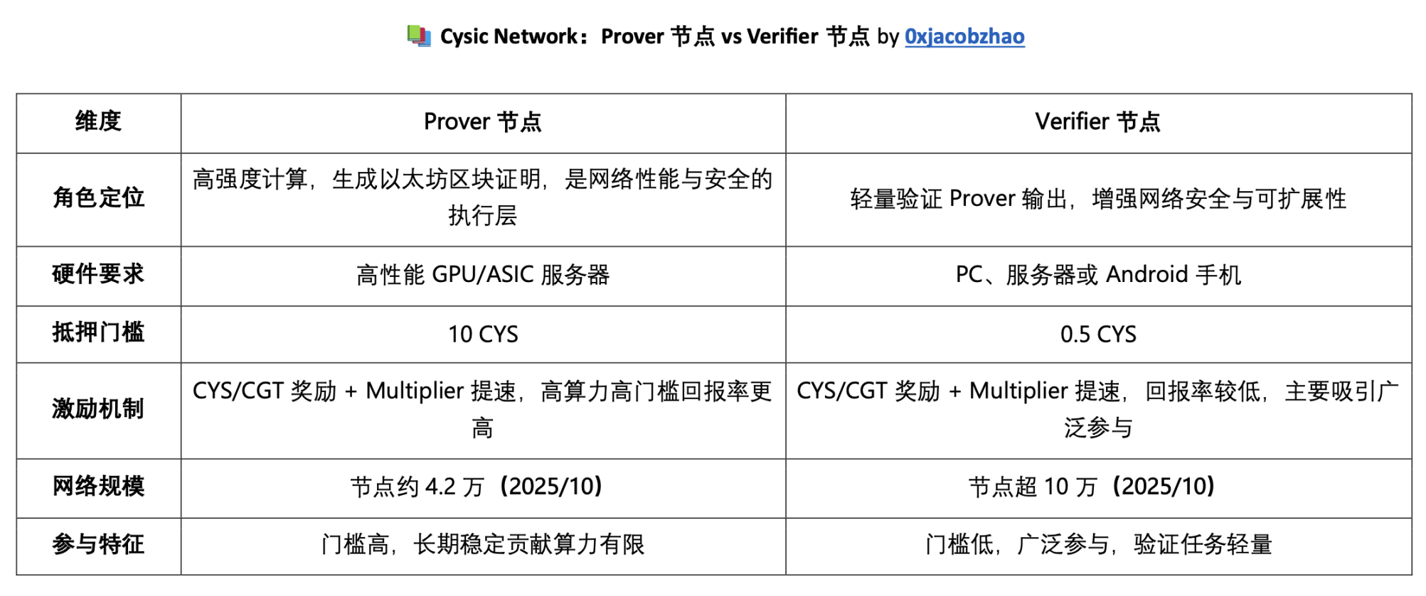Verifier 的参与门槛更低,仅需抵押 0.5 CYS 作为保证金,运行方式简单,可随时加入或退出。整体上,Verifier 以 低成本、轻参与的模式吸引更多用户加入,扩展了 Cysic 在移动端和大众层面的覆盖,增强网络的去中心化与可信验证能力。