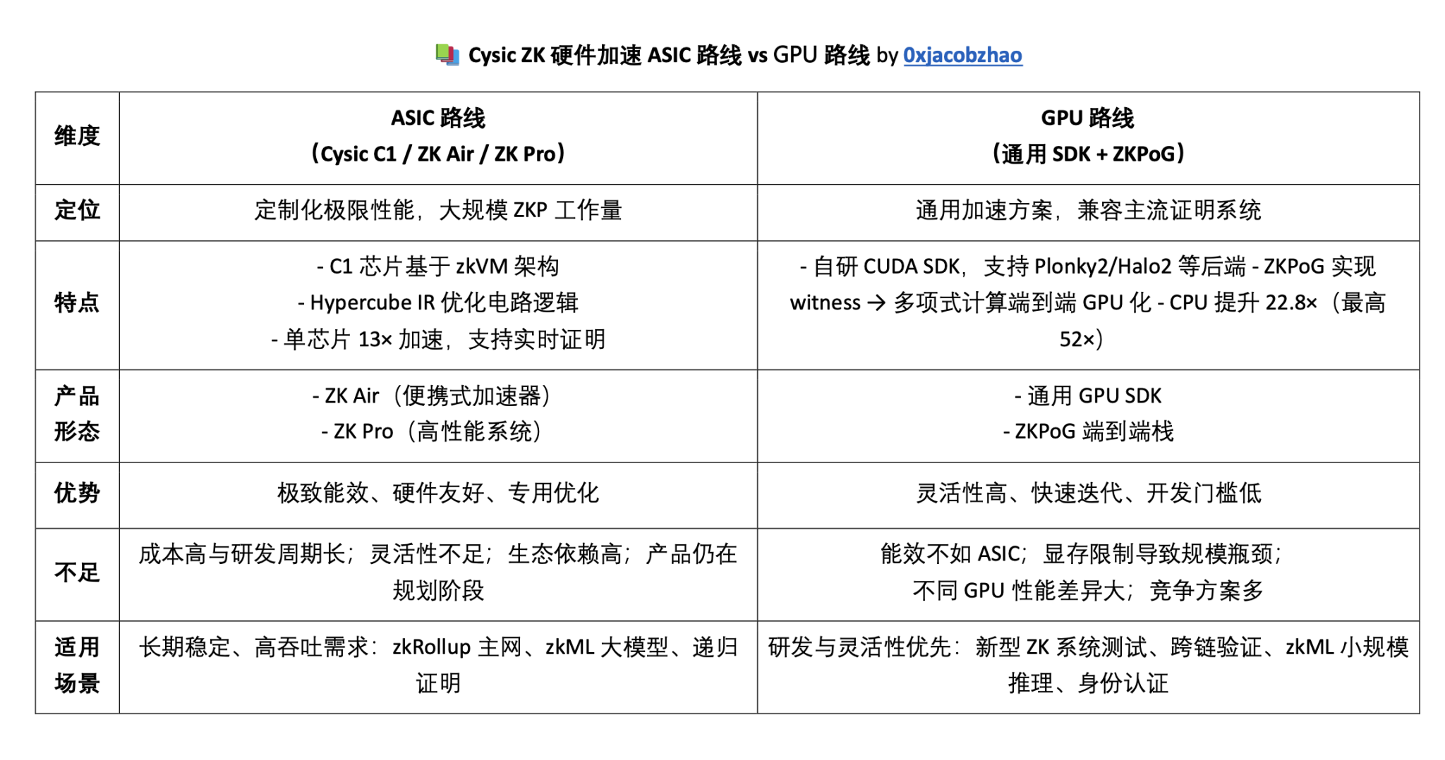 Cysic 的核心优势在于 零知识证明(ZK)的硬件加速。在代表性论文 《ZK Hardware Acceleration: The Past, the Present and the Future》 中,团队指出 GPU 具备灵活性和成本效率,而 ASIC 在能效和极致性能上更胜一筹,但需权衡开发成本与可编程性。Cysic 走 ASIC 创新 + GPU 加速 双线并进的路线,从定制芯片到通用 SDK,推动 ZK 从「可验证」走向「实时可用」。