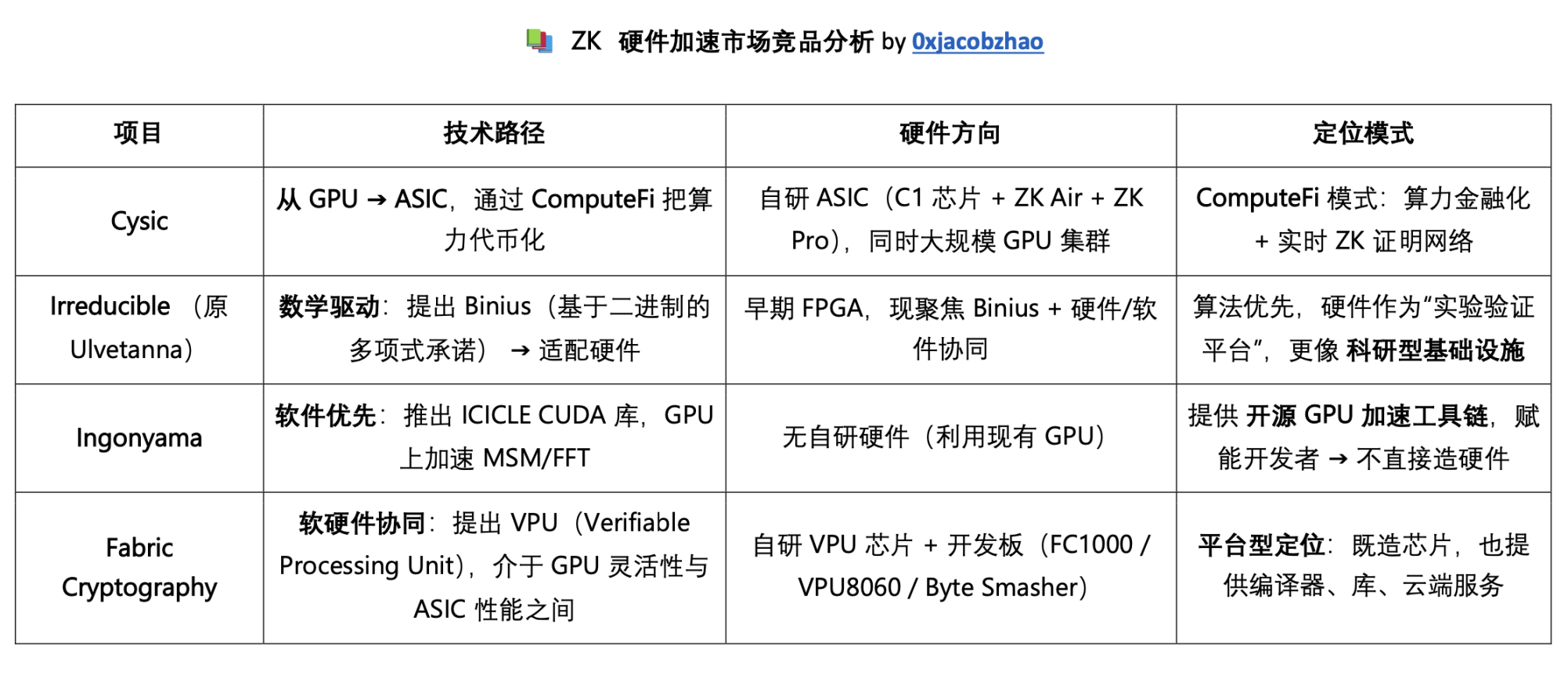- Ingonyama:开源友好,ICICLE SDK 已成为 GPU ZK 加速事实标准,生态采用率高,但缺乏自研硬件。