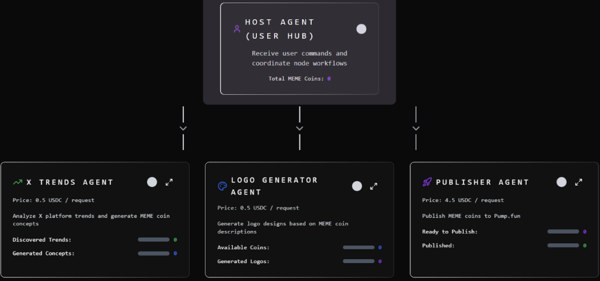 - X Trends Agent:实时解析 X 平台趋势,生成可转化为 MEME Coin 的创意概念;