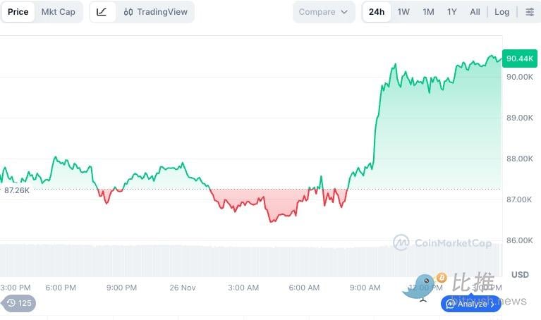 在经历数周低迷后,比特币在11月26日掀起一波强势反弹,价格突破9万美元大关,一举收复周二失地。此番上涨不仅打破了感恩节前的市场惯例,其背后更是宏观预期、资金回流与市场结构改善这三重利好共同作用的结果。