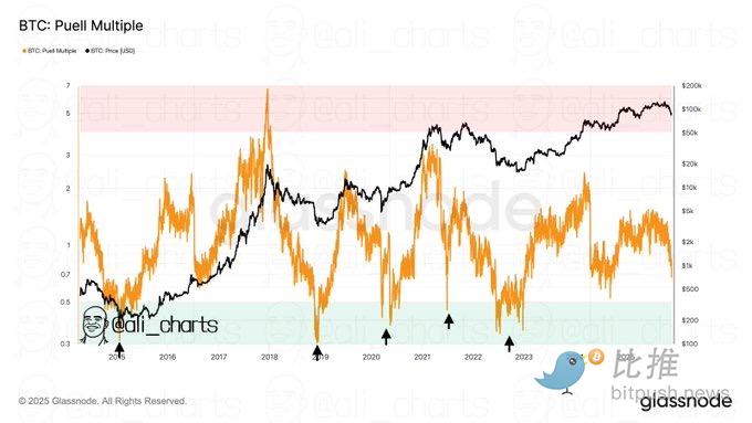 链上分析师 Ali 观察到,Puell Multiple 指标目前为 0.67,虽然尚未跌破历史周期底部的关键阈值 0.50,但已经非常接近。