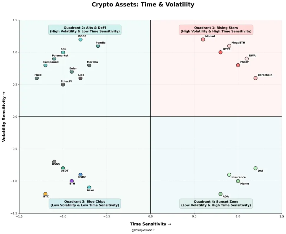 - 第一象限(新秀区):HYPE、PUMP、公链 /L2/Alt L1(Monad、Berachain、MegaETH)、RWA(Bond、Gold、Real Estate)