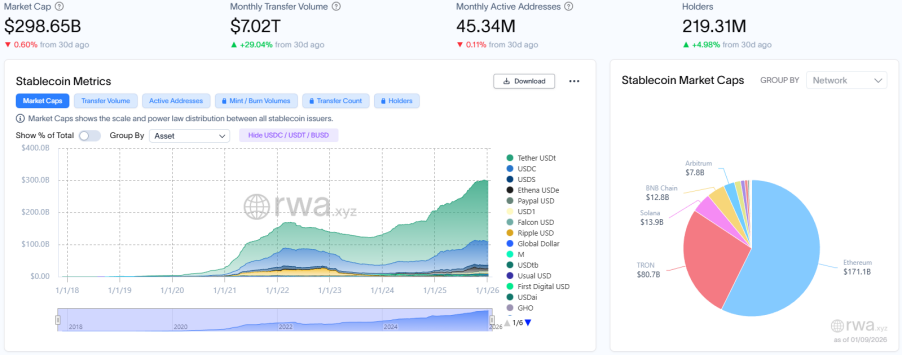 稳定币总市值达2,986.5亿美元,环比上月同期微降0.6%,整体规模连续收缩;月度转账量大幅跃升至7.02万亿美元,环比上月同期增长29.04%,显示存量资金周转效率显著提升;月活地址总数降至4,534万,环比上月同期微跌0.11%;持有者总数稳步增至约2.19亿,环比上月同期微增4.98%。两者持续背离,表明市场呈 “机构驱动的高频结算与散户活跃度停滞” 的结构性分化。