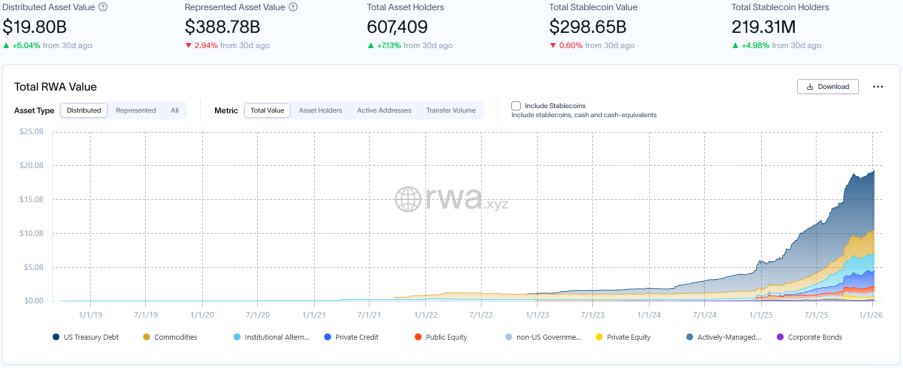 RWA.xyz 最新数据披露,截至2026年1月9日,RWA 链上总市值达198亿美元,环比上月同期微增6.04%,增速保持稳健,显示链上原生金融活动持续活跃;资产持有者总数增至约60.74万,环比上月同期上涨7.13%,增长强劲,投资者基础持续拓宽。