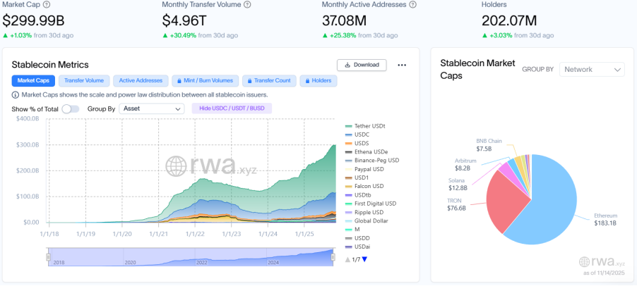 稳定币总市值达2,999.90亿美元,环比上月同期微增1.03%;月度转账量上涨至4.96万亿美元,环比上月同期大涨30.49%;月活地址总数显著增至3,708.00万,环比上月同期上涨25.38%;持有者总数稳步增长至2.02亿,环比上月同期微增3.03%,两者共同验证市场效率驱动型增长模式深化,存量资金周转效率与用户活跃度持续提升,链上支付结算功能进一步强化。数据表明,机构大额结算与零售交易共振持续,转账量增速与活跃地址增速均远超市值增长,凸显市场运行健康度提升。头部稳定币为USDT、USDC及USDS,其中USDT市值环比上月同期上涨1.63%;USDC市值环比上月同期微增0.28%;USDS流通量触达百亿美元大关,攀升至稳定币赛道第三,市值环比上月同期大涨12.36%。