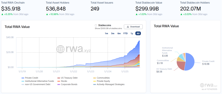 RWA.xyz 最新数据披露,截至2025年11月14日,RWA 链上总市值达359.10亿美元,环比上月同期提高5.35%,增速较前月明显放缓;资产持有者总数超53.68万,环比上月同期上涨10.96%,维持强劲增长;资产发行方总数增加至249家。