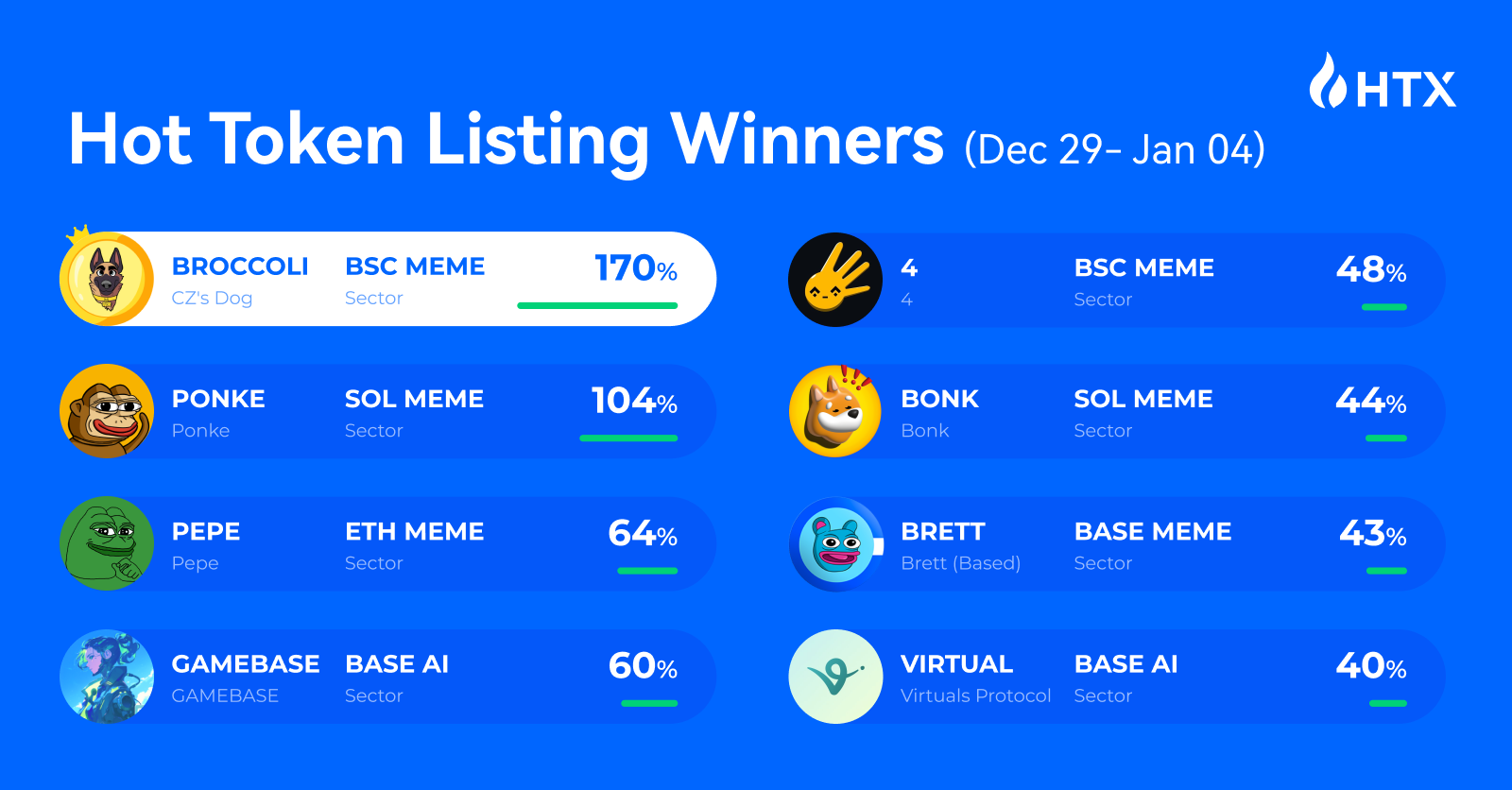 2025年底至2026年开年,加密市场在震荡中逐步修复风险偏好。随着市场流动性阶段性回暖,资金开始从防御型资产向高弹性板块扩散,情绪驱动特征明显增强,Meme资产再度成为市场关注焦点。过去一周(12月29日—2026年1月4日)期间,火币HTX 多项Meme资产全面爆发,BSC、Solana、Base、Ethereum、TRON等多链生态轮动上行,成为本周市场最具代表性的结构性行情。