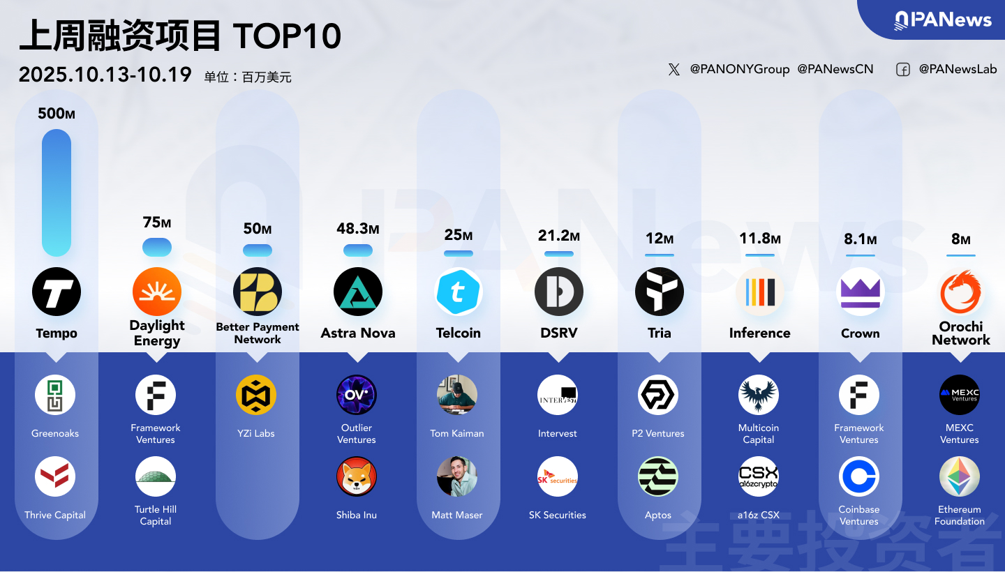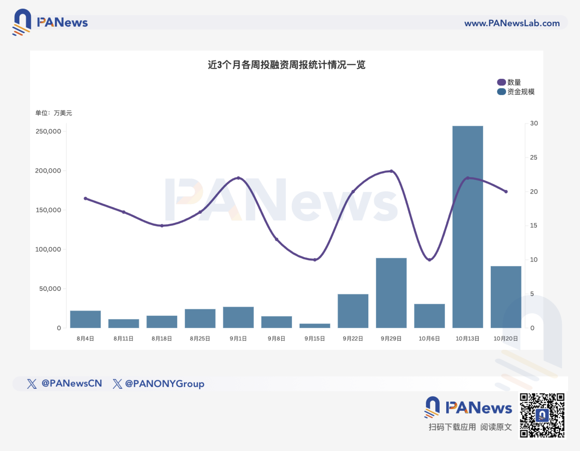据 PANews 不完全统计,上周(10.13-10.19)全球区块链有20起投融资事件,资金总规模超7.86亿美元;此外,上市公司加密资产储备融资总额超2.58亿美元,概览如下概览如下:
