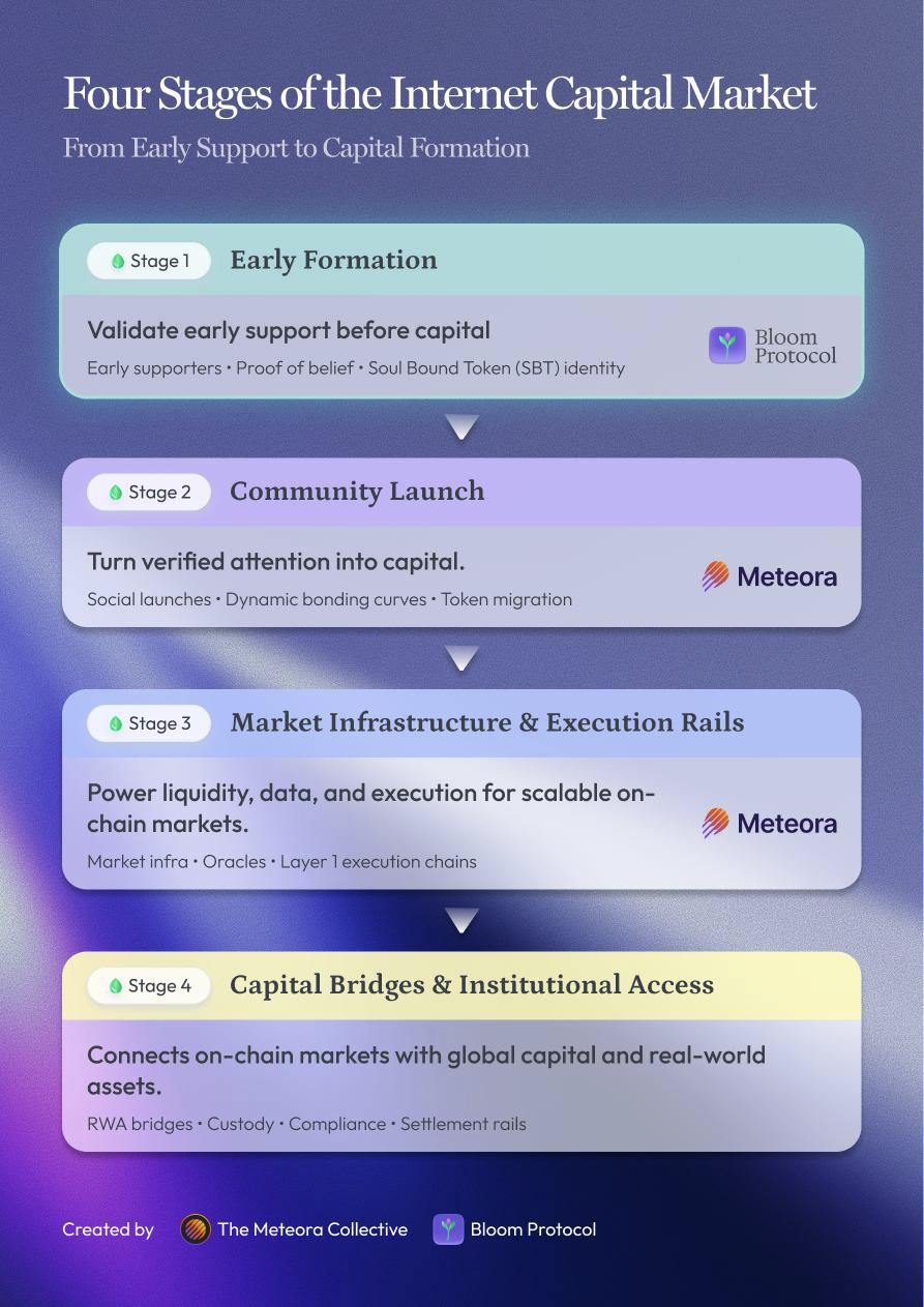 在这一体系中,Bloom Protocol 聚焦于最上游的“早期形成层”,负责识别并验证真正的社区支持;Meteora 则在“社区发行层”承担关键角色,让注意力可以迅速转化为可交易的资本;Solana 的基础设施提供制度级别的执行环境,确保交易的公平性与一致性;而现实世界资产桥梁层则把链上资本与传统金融体系连接起来,使互联网资本市场的增长能延伸到数万亿美元的现实经济。