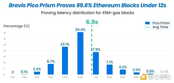Pico Prism 由Brevis 开发,使用配备 64 块 RTX 5090 GPU 的消费级硬件实现了以太坊 Layer-1 的实时证明 (RTP)。在9月份进行的测试中,Pico Prism在不到12秒的时间内实现了99.6%的实时证明。