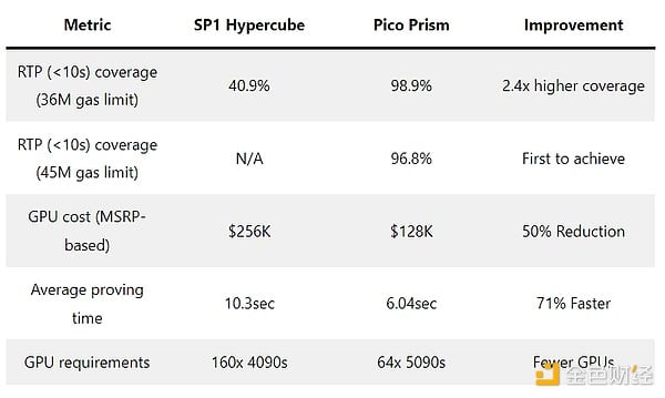 除了单项指标外,Pico Prism 在速度和成本效率(以平均验证时间 × 硬件成本计算)方面,相比 SP1 实现了 3.4 倍的性能优势。