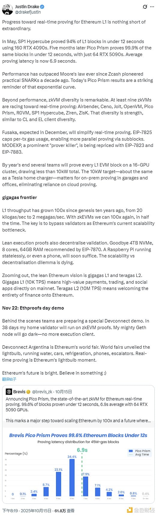 10月15日,Vitalik转推,并发文:“很高兴看到@brevis_zk的Pico Prism进入ZK-EVM验证领域!ZK-EVM验证速度和多样性迈出了重要一步。”