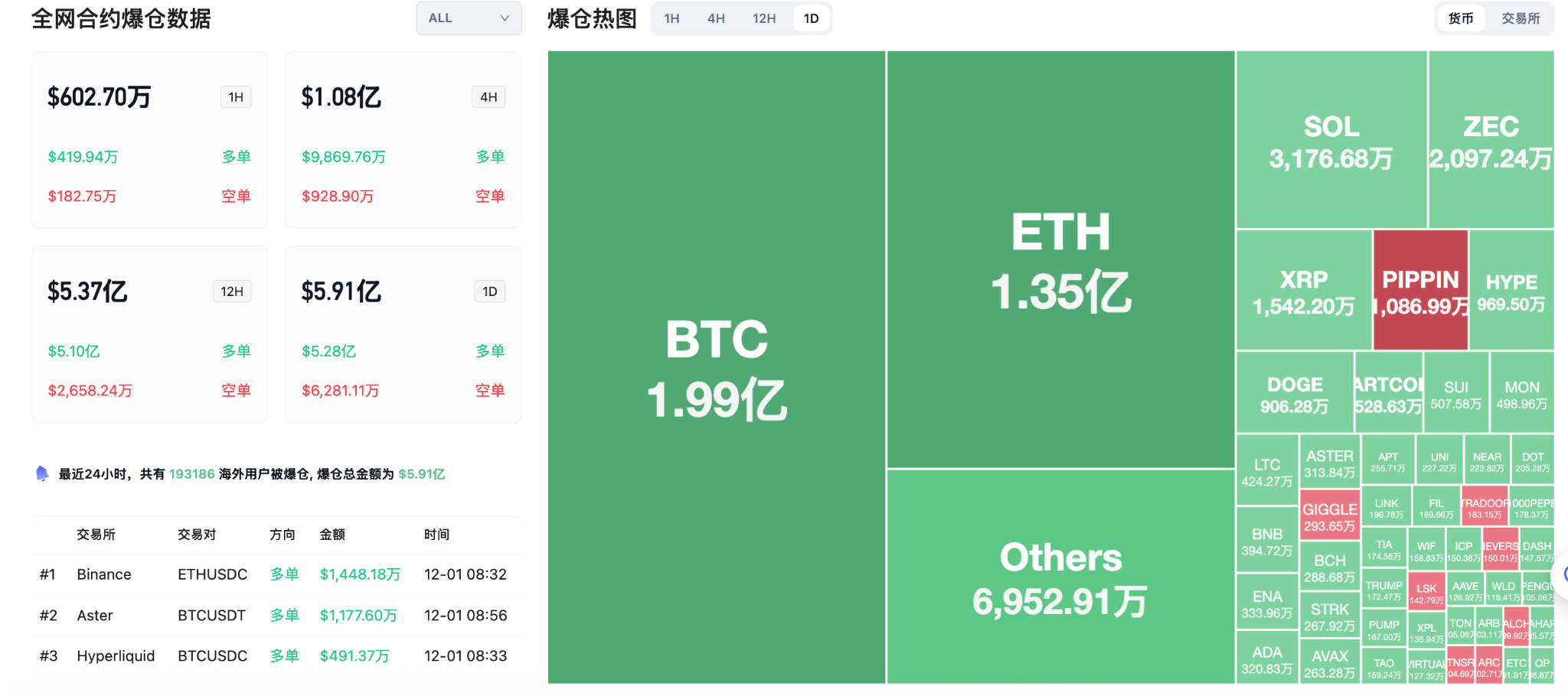 24小时爆仓数据:全球共193186人被爆仓 ,爆仓总金额为5.91亿美元,其BTC爆仓1.99亿美元、ETH爆仓1.35亿美元、SOL爆仓3177万美元